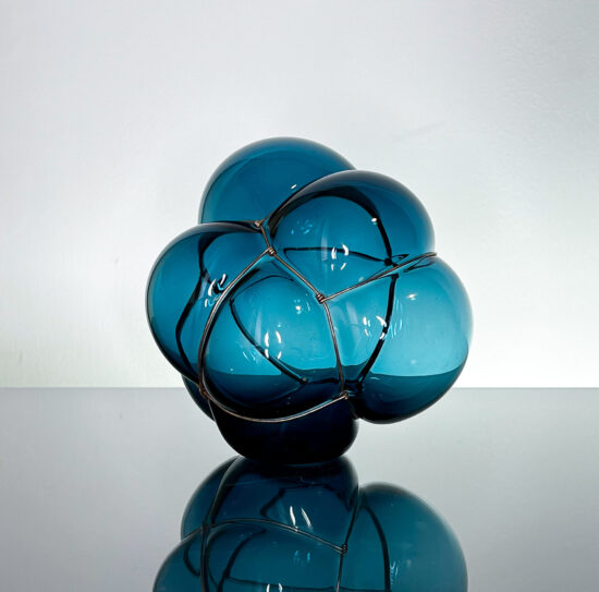 Molten glass blown into a copper cage restricting the bubble and freezing in time.