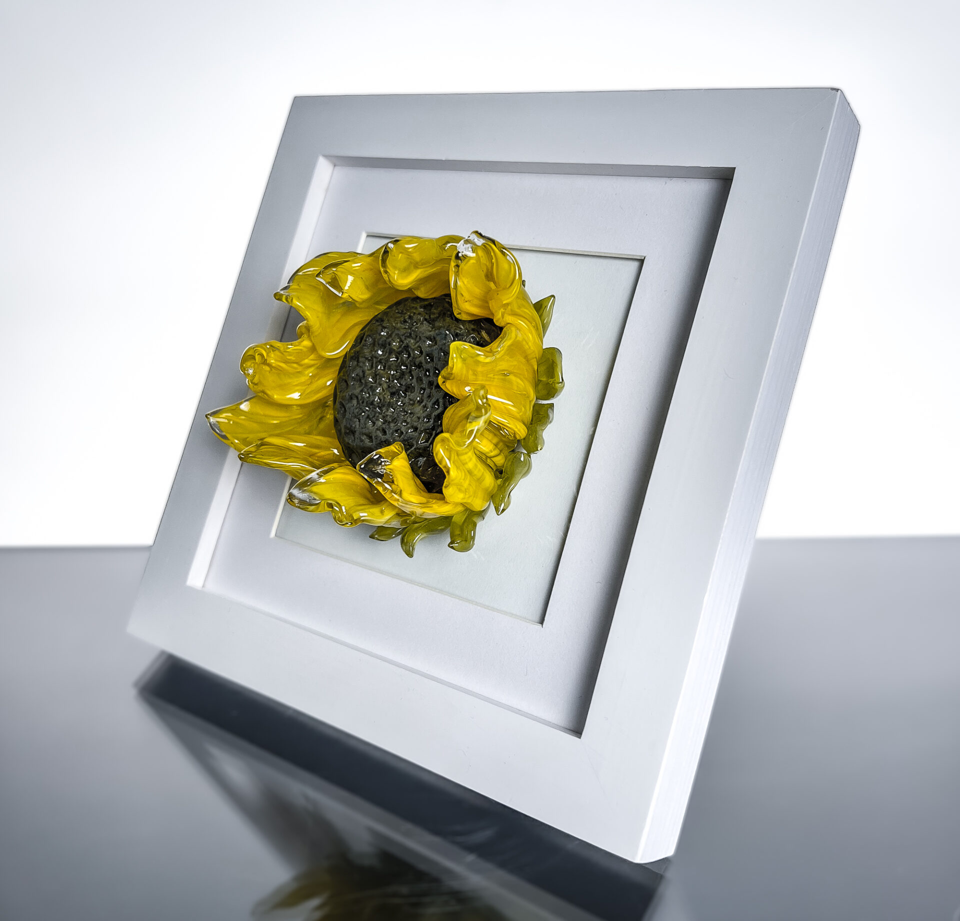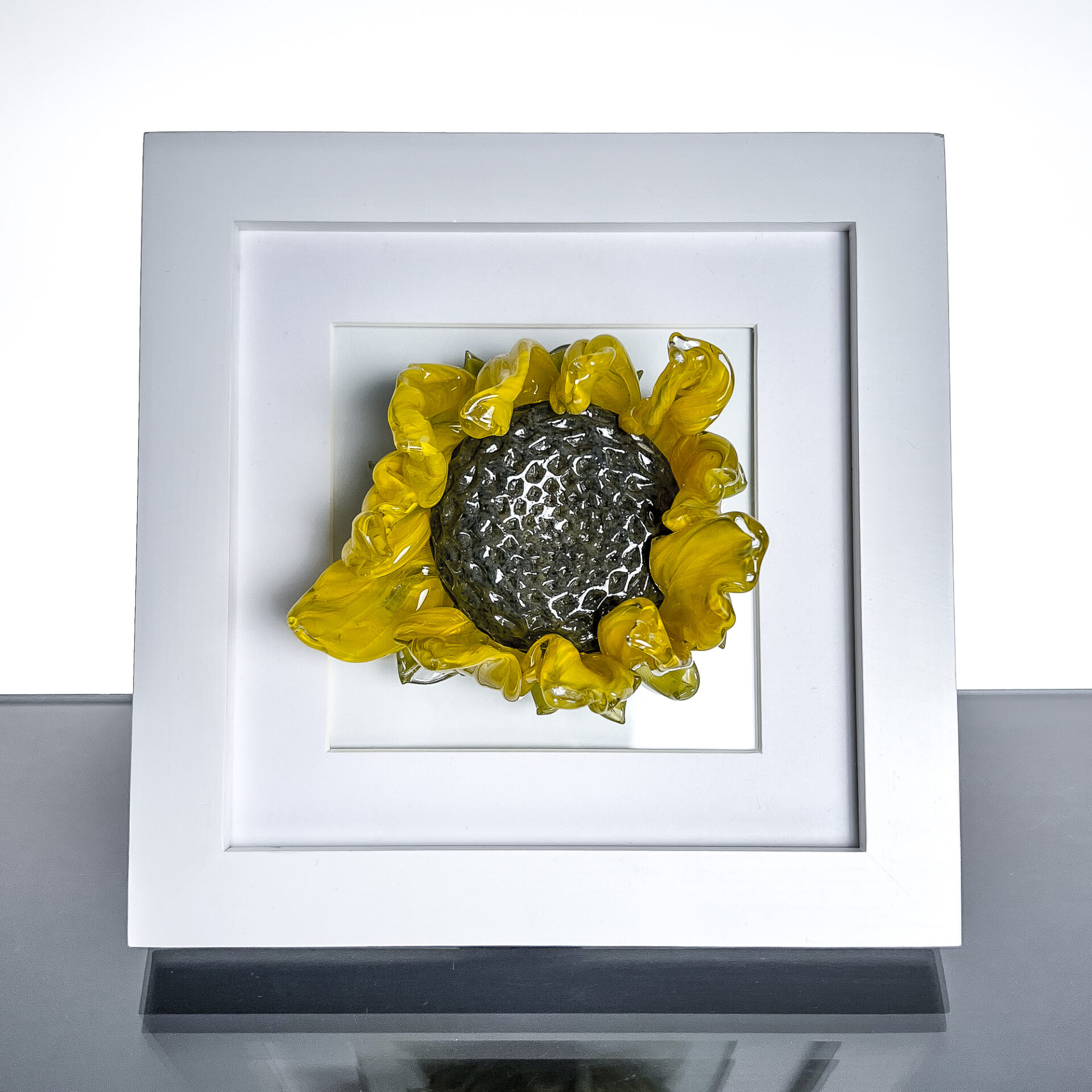 Sculpted Glass Wilted Sunflower in a white frame