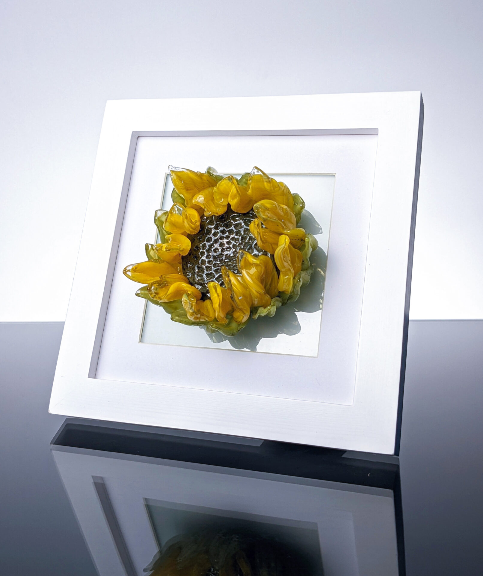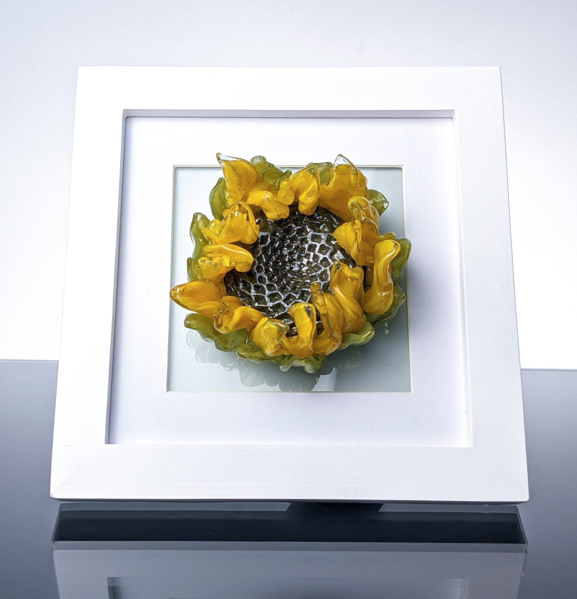 Sculpted Glass Wilted Sunflower in a white frame