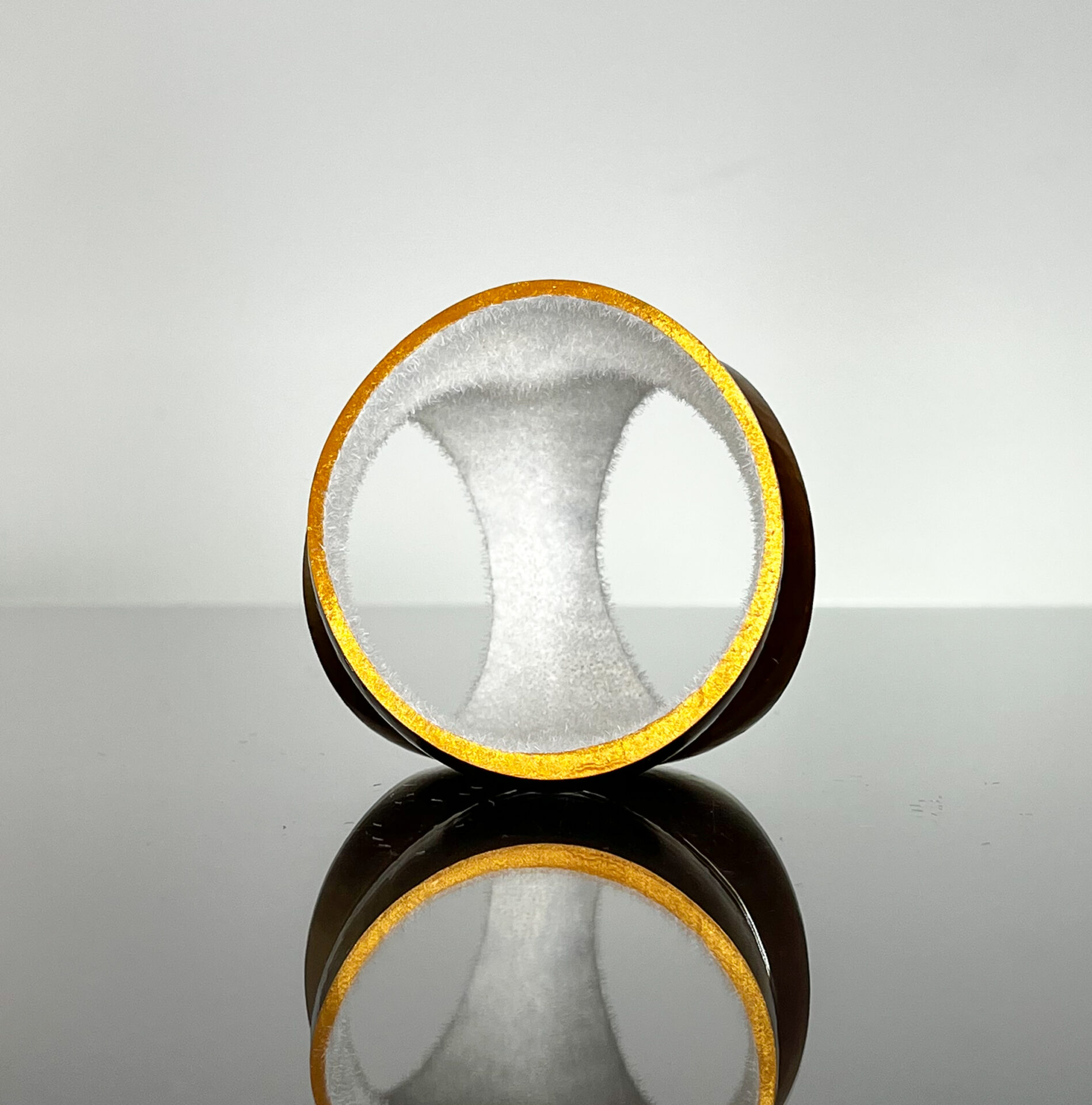Molten glass blown into a copper cage restricting the bubble and freezing in time. This piece has been cut open and adorned with a fuzzy interior.
