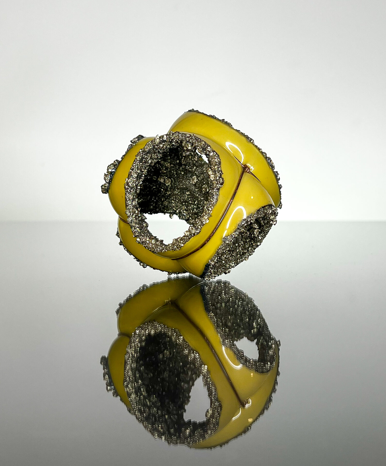 Molten glass blown into a copper cage restricting the bubble and freezing in time. This piece has been cut open and adorned with fool’s gold to give a sparkling textured interior