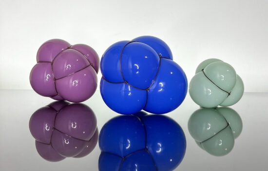 Molten glass blown into a copper cage restricting the bubble and freezing in time.